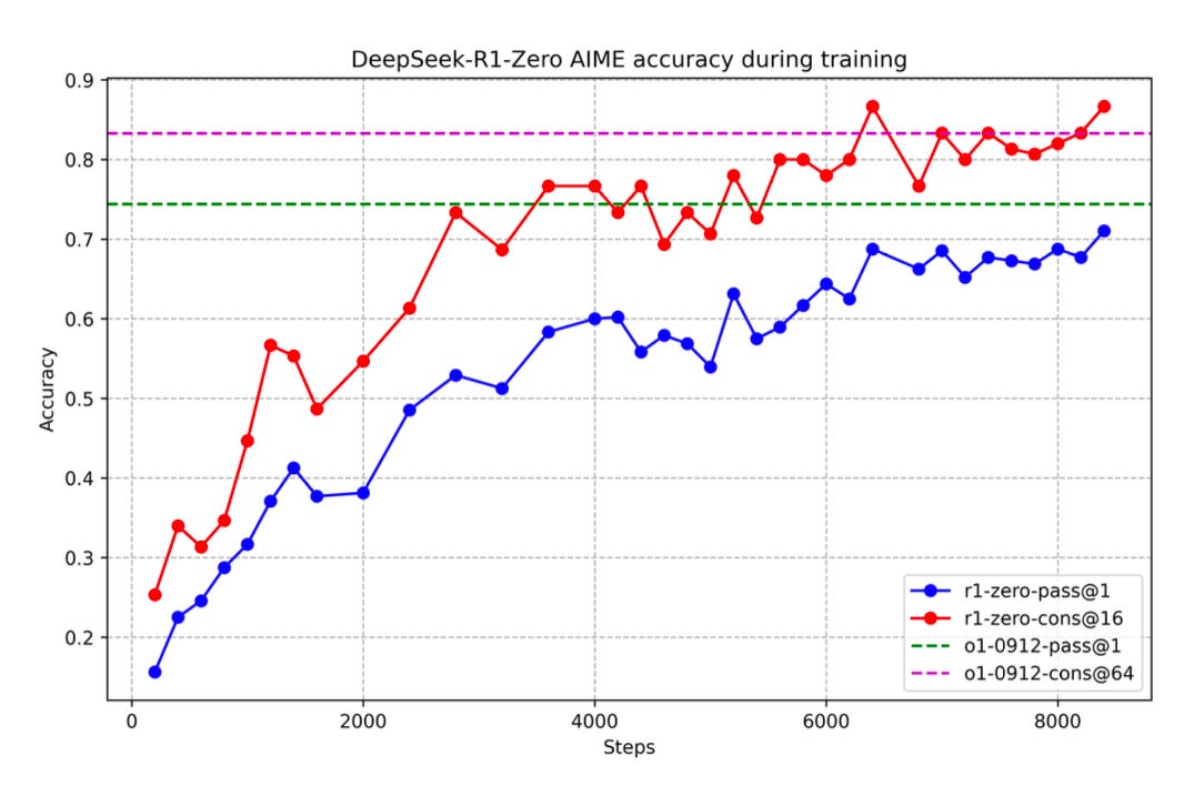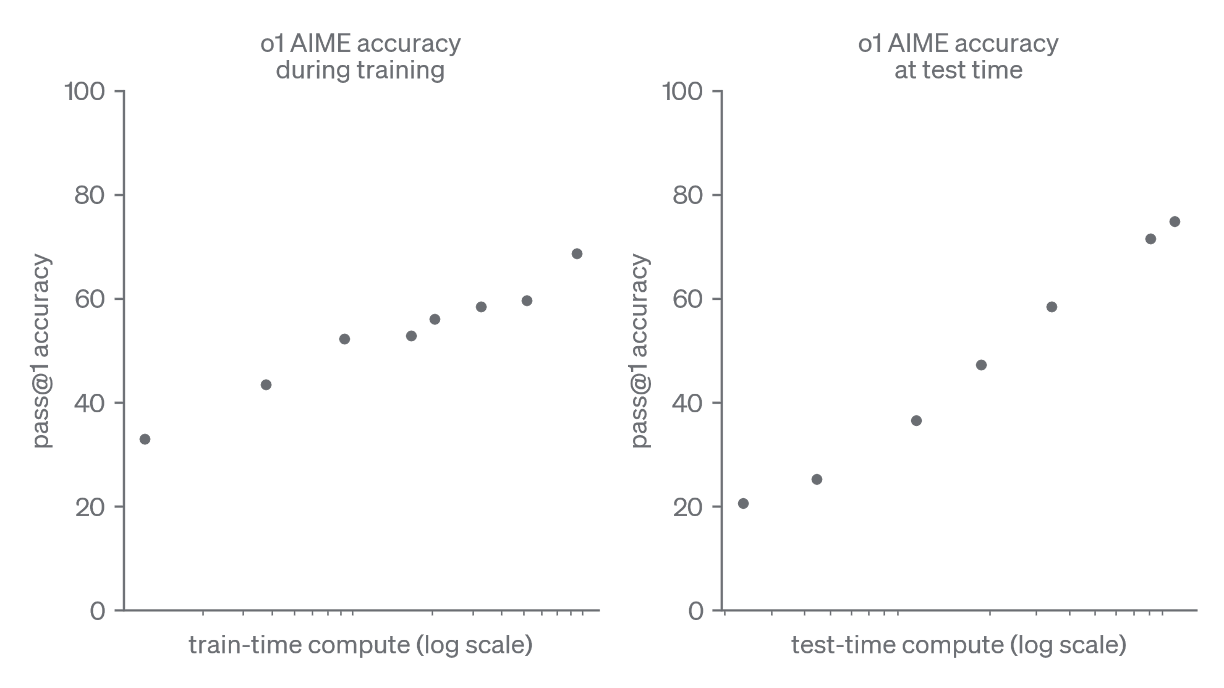 Purely through RL, OpenAI showed that the model’s pass@1 accuracy scaled from ~30% to ~70%. This metric describes the LLM’s ability to generate a correct response on its first attempt—an important capability when applying TTS because errant, interim logical steps can explode inference costs.