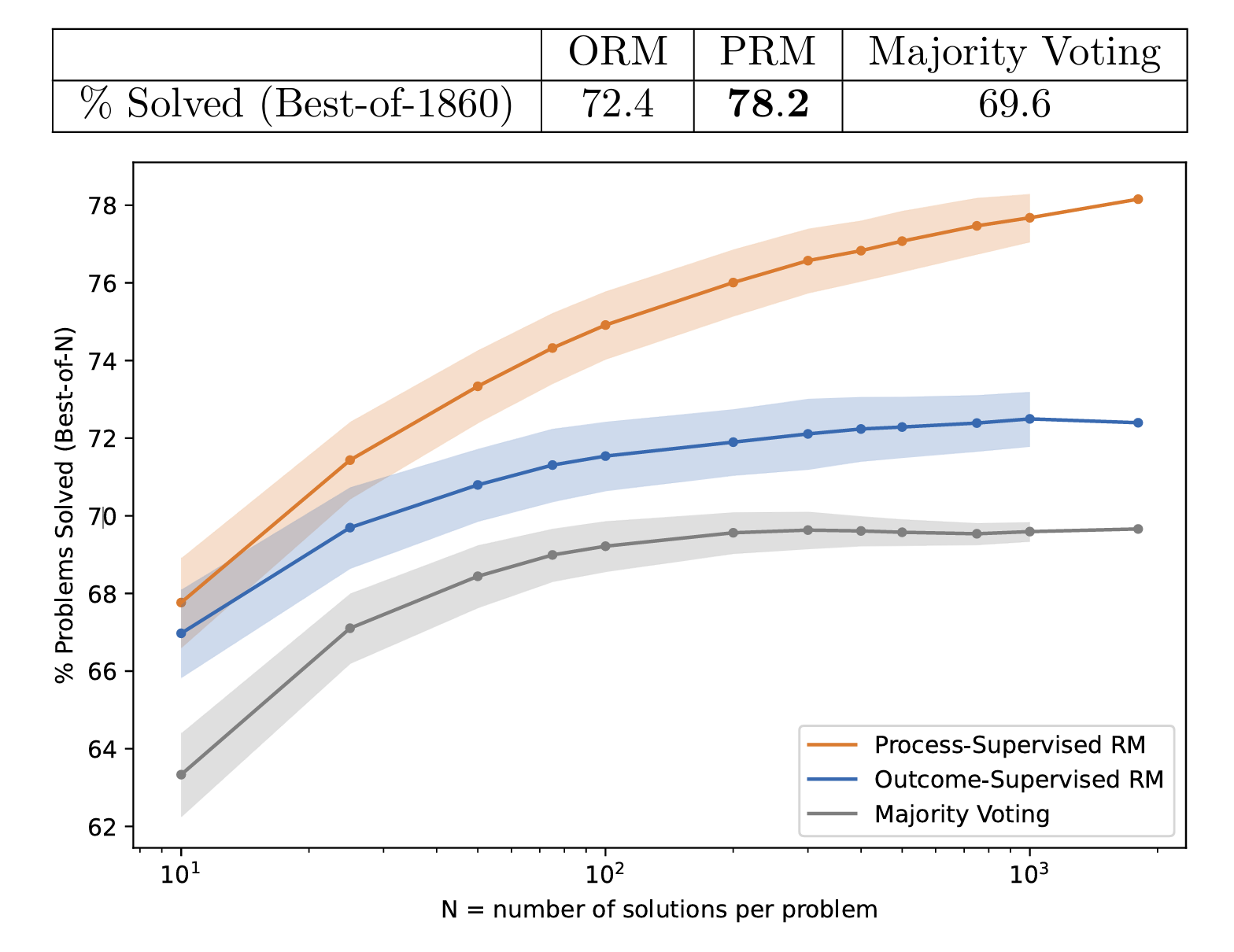 In the bake-off, they used GPT4 to generate several candidate solutions per MATH problem and asked each reward model to score them and select the solution with the highest rank. They then plotted the percentage of MATH problems where the reward model’s selected highest-ranked solution is the correct final answer. The PRM outperforms the ORM and simple majority voting across the board.