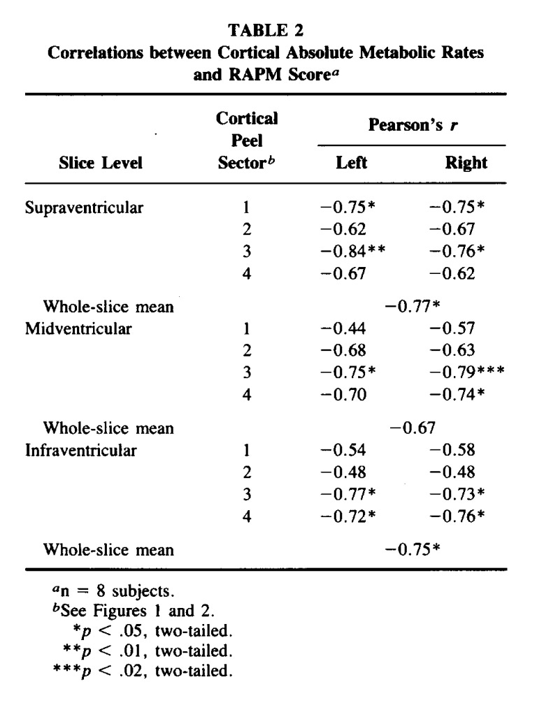 Interestingly, they discovered that humans performing worse on reasoning tasks—folks who were struggling through the tasks—utilized more glucose than their peers who breezed through problems. As shown below, all statistically-significant associations between task score and absolute glucose metabolic rate were negative. Therefore, task difficulty creates increased metabolic demand.