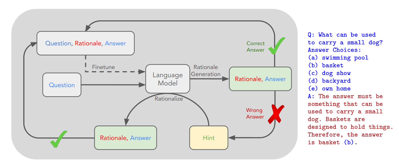 CoT proved that simple post-training techniques could amplify latent reasoning capabilities of sufficiently large base models. STaR exploits these capabilities, using the LLM to build its own SFT library of correctly reasoned responses. Incorrectly reasoned responses are sent to an MKO—a human oracle—that corrects the output, allowing the model to then infill a plausible reasoning trace, as diagrammed below.