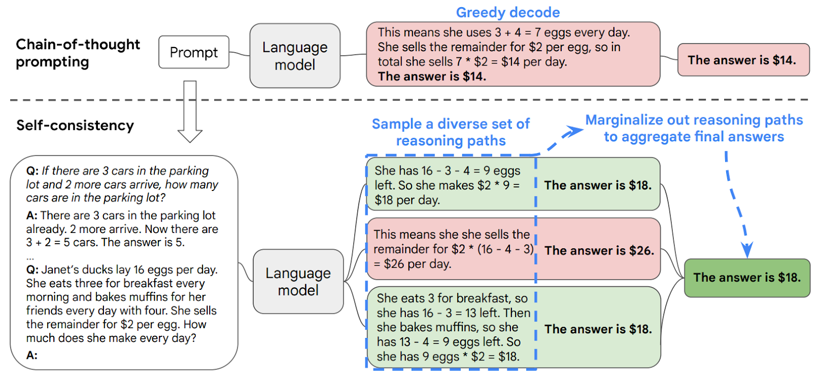The Google Brain team improved upon the original CoT work in 2022 with the notion of self-consistency (SC). Specifically, they modify the LLM’s decoder—the part of the model that generates output tokens—to create multiple, divergent reasoning paths instead of simple next-token (i.e., greedy) decoding.