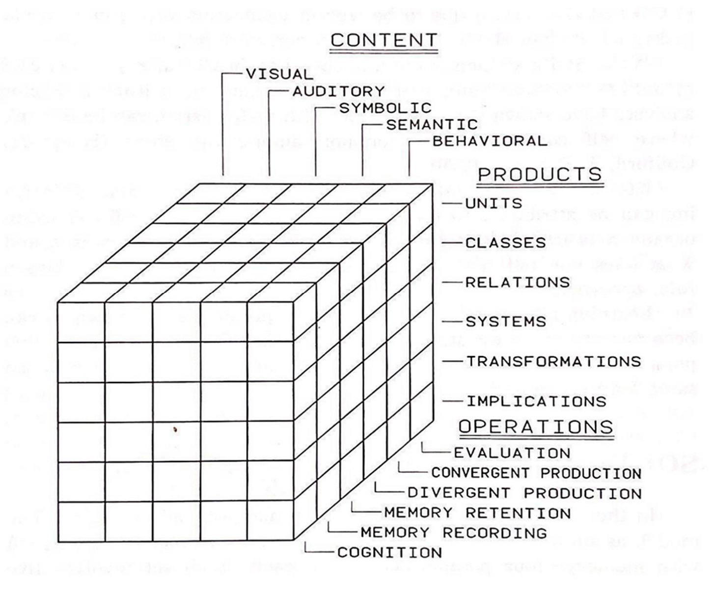 In his 1955 text on The Nature of Human Intelligence, psychologist J.P. Guilford introduced the Structure of Intellect theory. Guilford decomposed the entirety of the human cognitive apparatus into a grandiose Rubik’s Cube-like structure—each dimension representing a facet of human intelligence, as shown below.