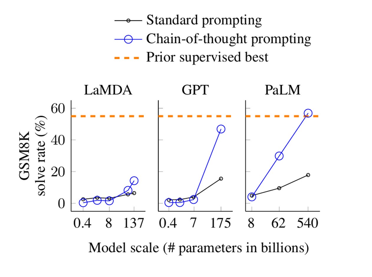 This technique boosted performance across a wider set of tasks ranging from language reasoning, to arithmetic, to symbolic logic—all without fine-tuning the base model. Curiously, CoT prompting elicited an effect only beyond certain model parameter sizes. This was the exact same result from the previous scratchpad work, as shown below.