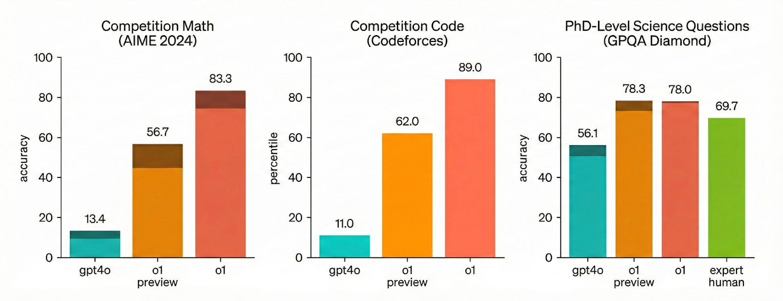 The Bitter Lesson—that general ML methods leveraging scale outperform those with brittle human heuristics—is still alive and well. However, it’s being refined. Contemporary post-training methods (e.g., reinforcement learning, RL) and the burgeoning field of test-time scaling (TTS) prove that some form of inductive human bias—like the way we think—is general enough and powerful enough to enable discontinuous leaps in LLM performance compared to brute-force pretraining, as shown below by OpenAI.