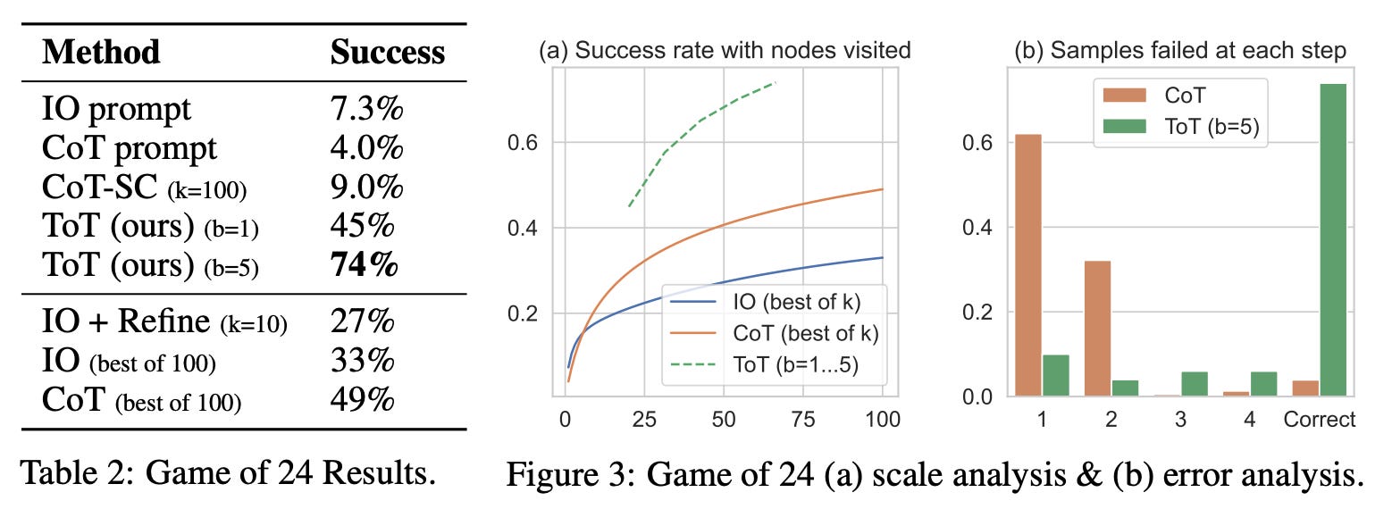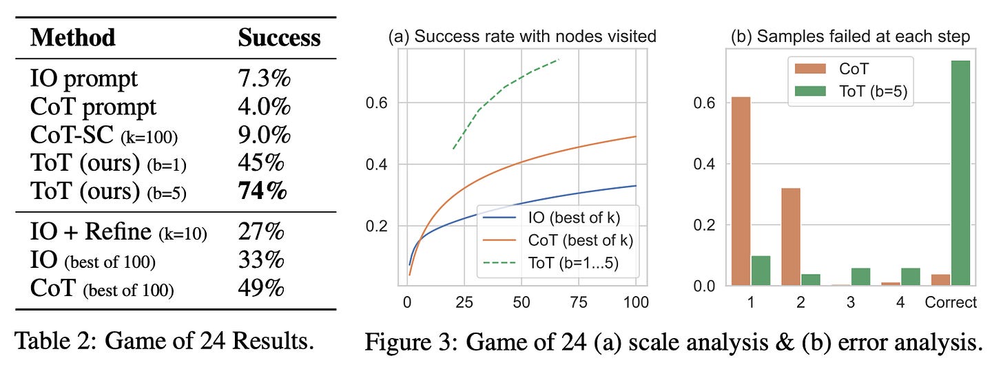 Researchers from Google and Princeton leveraged problem space theory when they developed the tree-of-thought (ToT) reasoning framework. Recall that the previous SC method still relied on post hoc majority-voting of independent, autoregressive reasoning paths. By contrast, ToT uses a branched reasoning structure, as diagrammed below.