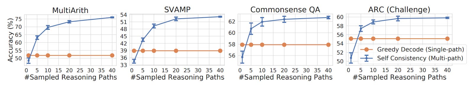 Meanwhile, SC involves sampling the LLM decoder to produce a set of reasoning paths then finding the most consistent answer to converge onto. This is predicated on the notion that reasoning errors are random and that it’s statistically unlikely for a wrong idea to be consistently repeated given enough samples (k).
