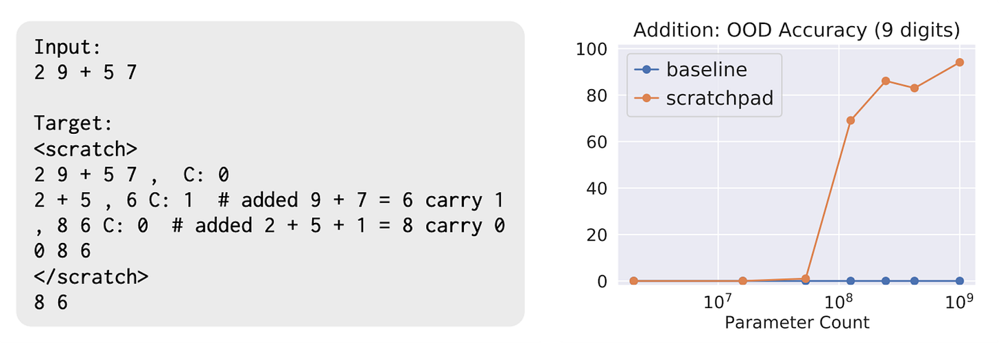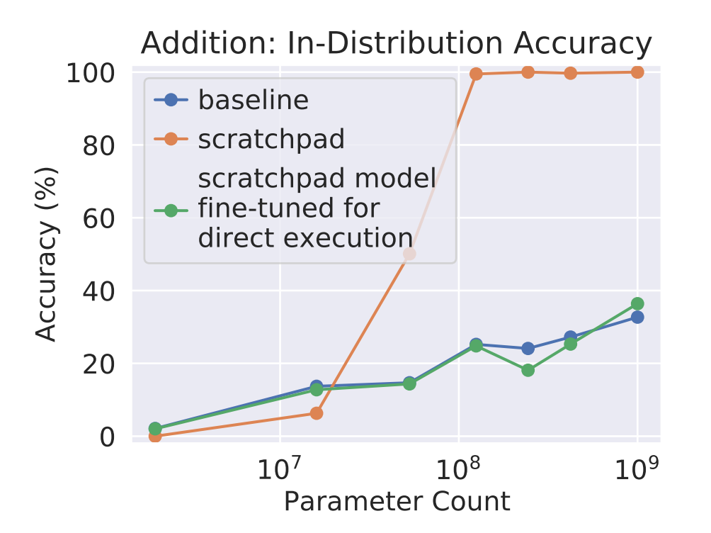 Nye et al. showed in 2021 that doing supervised fine-tuning (SFT) with a 100,000-member library (i.e., a scratchpad) of fully worked out addition problems could boost an LLM’s performance. Essentially, the researchers sat an LLM at the front of the class for a private, long-addition tutoring session with step-by-step examples. Following a gradient update, the model was prompted to produce intermediate steps and the computed output. Interestingly, this technique only had an effect on base models above a certain size, as plotted below.