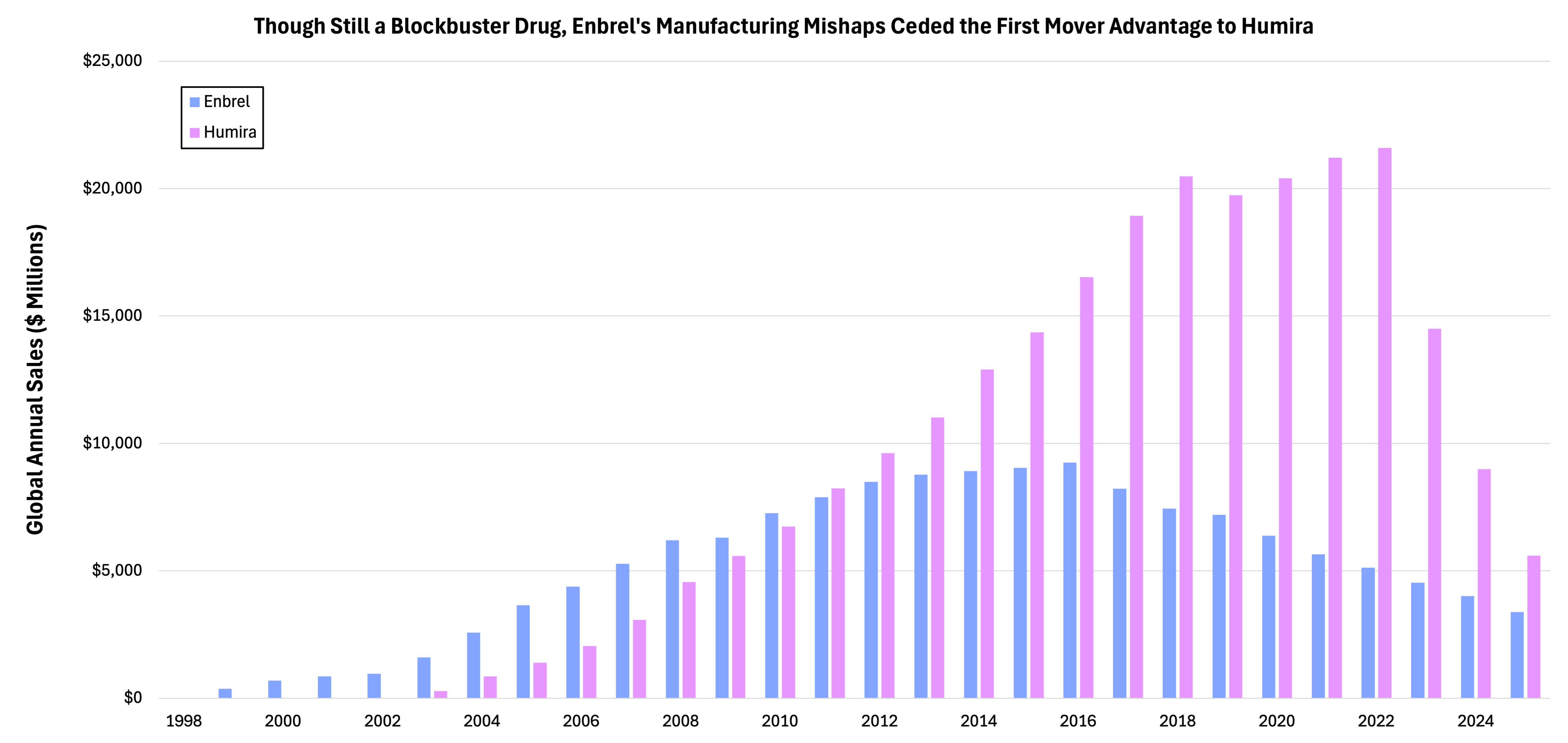 The window of opportunity had shut. By 2010, Enbrel sales retrenched while Humira—AbbVie’s TNF molecule—grew to become the best-selling drug in history.