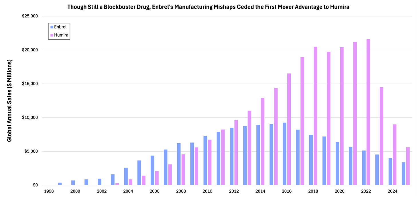 Even after Amgen’s ~$10 billion acquisition of Immunex, the duo struggled to ramp Enbrel’s production capacity, with one Rhode Island facility failing to meet the FDA’s minimum 60% batch success rate.