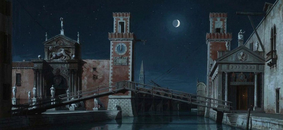 Veneered with decades of dried pitch, the arsenalotti’s struts still lined the slipways, unexplained and enduring.