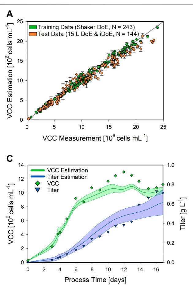 Despite training on a minimal data corpus from a 300mL shake flask, the hybrid setup transferred to a 15L stirred-tank bioreactor, predicting viable cell concentration and product titer with roughly 11% and 18% normalized error, respectively.